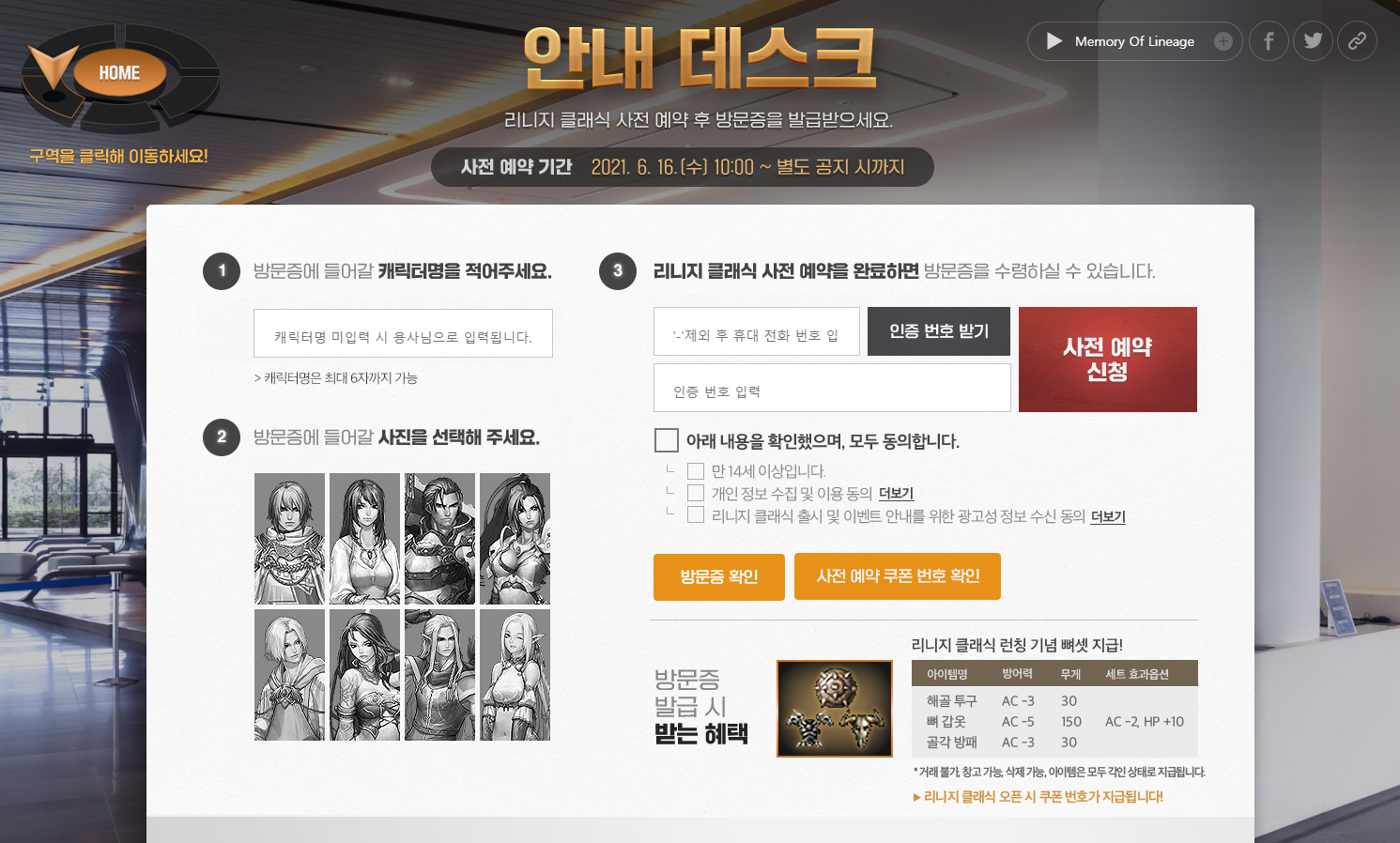 안내 데스크에서는 리니지 클래식 사전 예약을 할 수 있습니다.