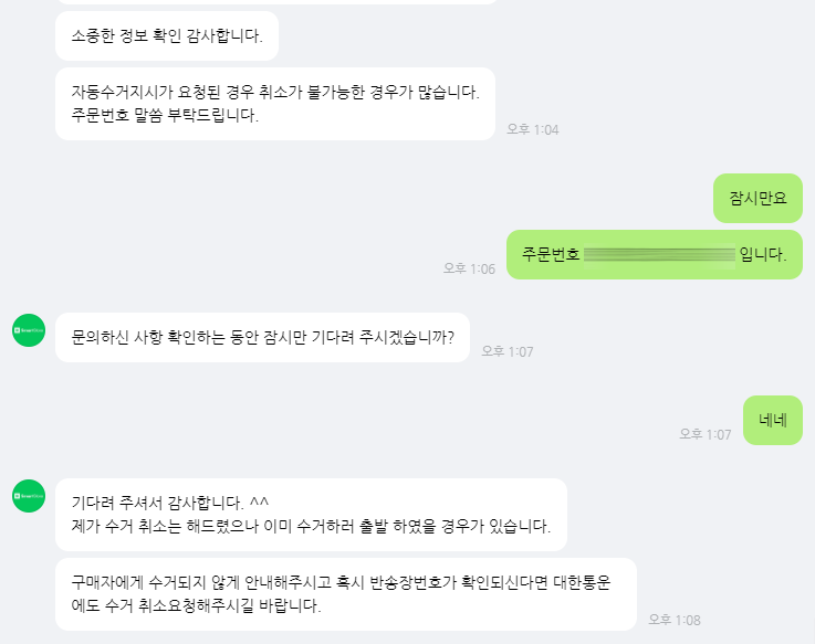 다만, 택배 기사님이 이미 수거를 출발 했을 경우 구매자에게 수거되지 않도록 안내를 해야하는 점 잊지 마세요!