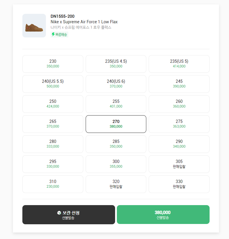 보관 판매는 왼쪽 보관 신청을, 일반 판매는 오른쪽 가격을 선택해주면 됩니다.